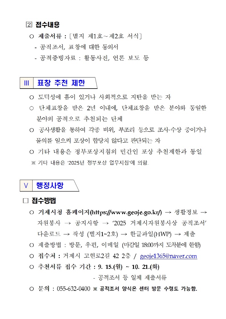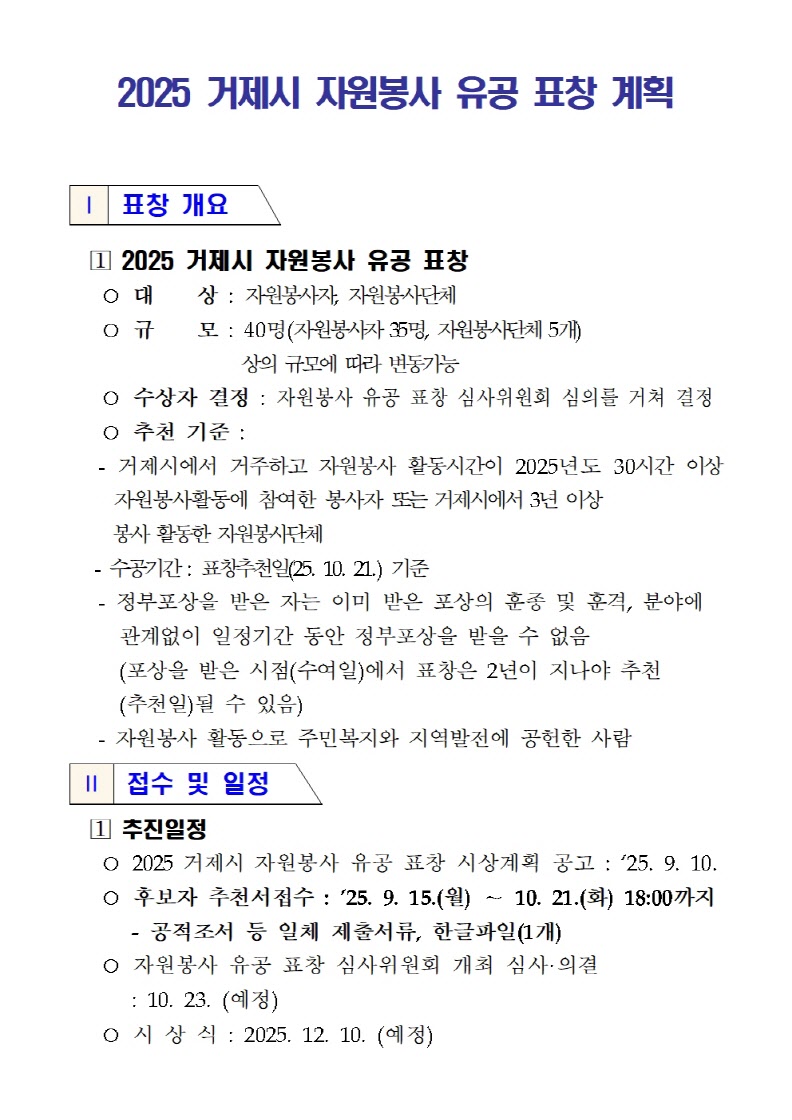 2025년 거제시 자원봉사상 추천서류 접수기간 변경사항을 아래와 같이 알려드립니다.