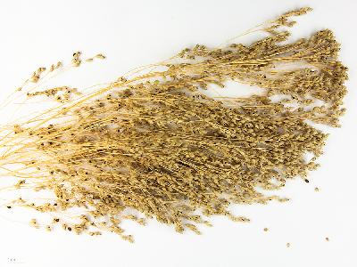 분열한 줄기(莖; Stem)마다 이삭이 나오고 월뿔모양꽃차례(圓錐花序; Panicle)를 이루며 고개를 숙인다. 열매(果實; Fruit)는 익으면 떨어지기 쉽고 도정하면 조와 비슷하나 조보다 굵다.