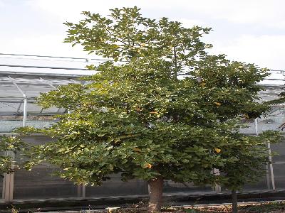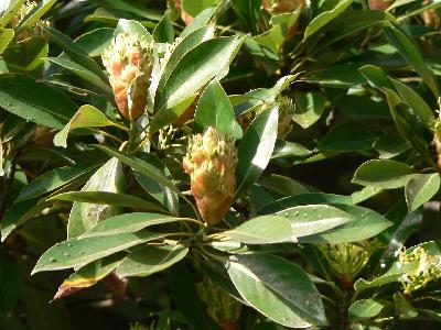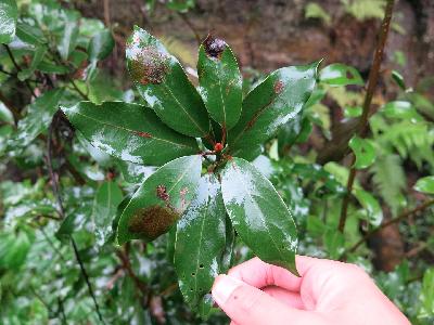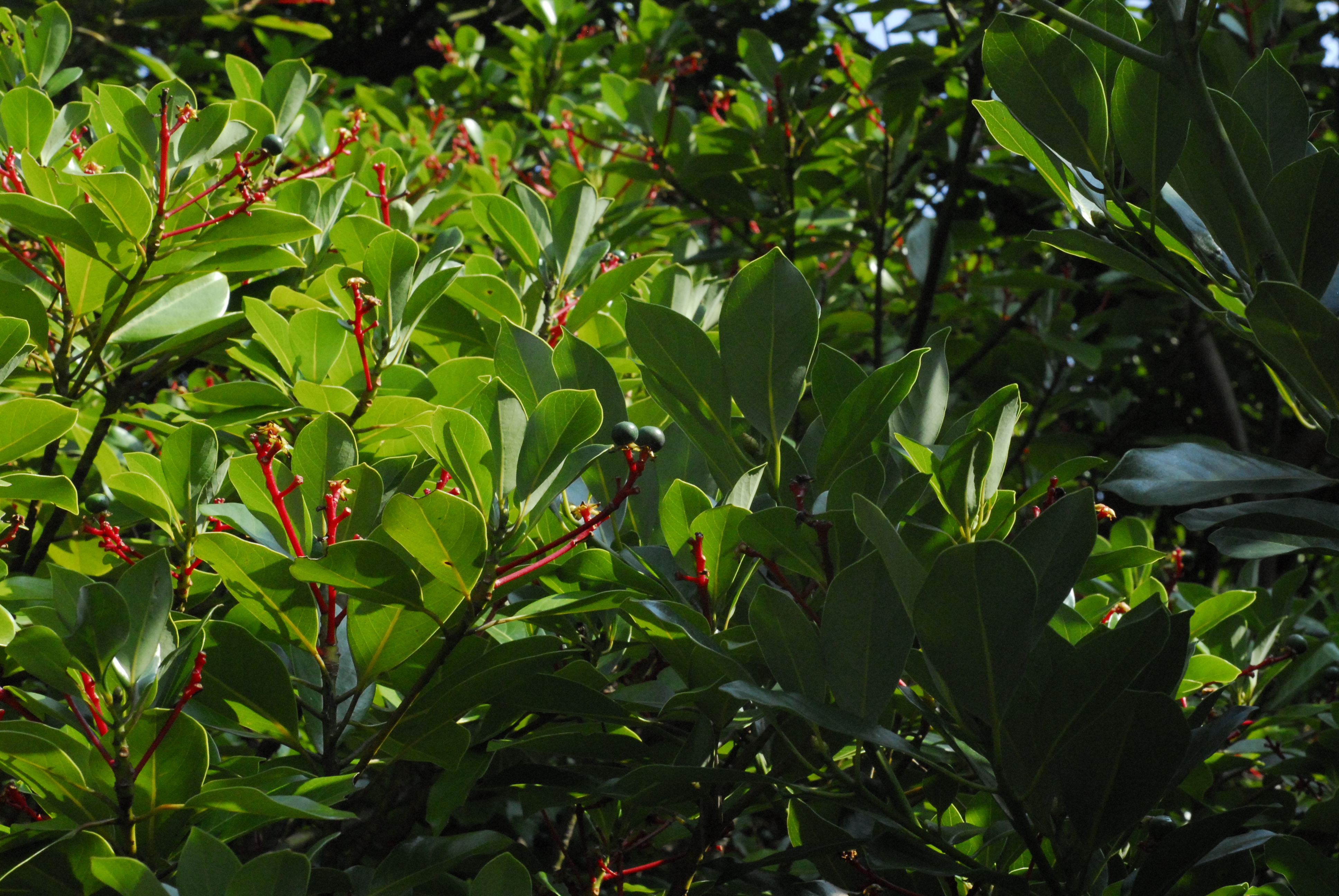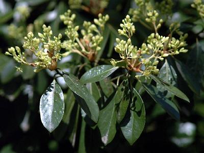 잎은 어긋나기 하며, 길이 7-15㎝의 거꿀달걀모양(倒卵形; Obovate), 긴타원모양(長橢圓形; Oblong) 이다. 표면은 짙은 녹색(綠色; Green,)이고 광택(光澤狀; Lustrous)이 있으며, 뒷면은 회녹색(灰綠色; Grayish Green)이 돈다. 잎자루(葉柄; Petiole)는 길이 2-3㎝.다.
