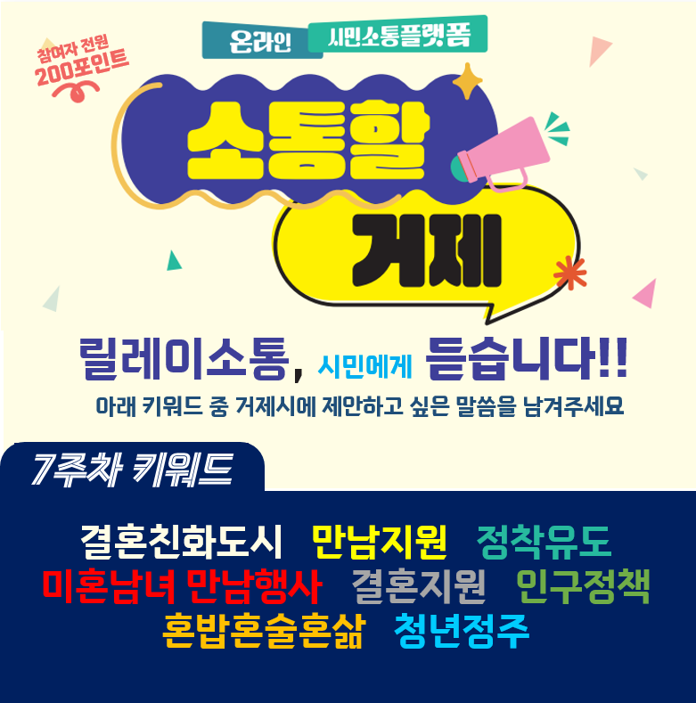일회성 만남 주선 정책과 더불어 평소 젊은이들이 함께할 수있는 장소(청년복지관)가 있으면 좋겠습니다2025-08-04 06:05:32